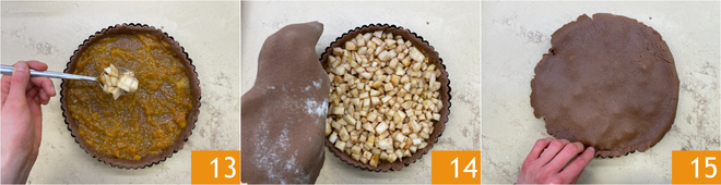 Añadid los cubitos de pera 13 y cubrid con la segunda capa de masa 14. Sellad bien los bordes presionando con los dedos 15.