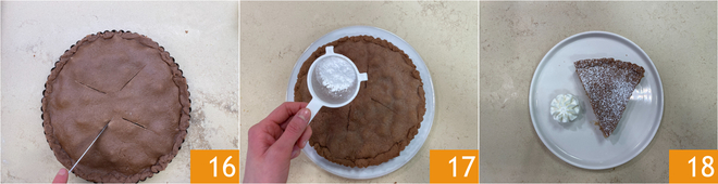 Haced 4 cortes en la superficie 16 y hornead en horno estático precalentado a 180° durante unos 40 minutos, colocando el molde en la bandeja más baja. Una vez cocida, sacadla del horno y dejadla enfriar completamente, luego espolvoread con azúcar glas 17. ¡Vuestra tarta vegana está lista para servir con un copete de nata vegetal montada, si la deseáis 18!
