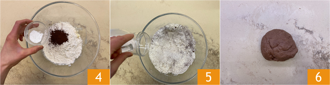 Continuad con el cacao y la levadura 4, luego mezclad rápidamente y verted la bebida vegetal 5. Amasad a mano hasta obtener una bola, envolvedla en film transparente y dejad reposar en el frigorífico aproximadamente una hora 6.