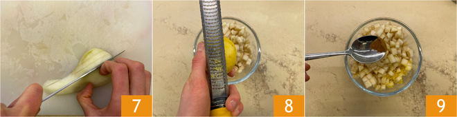 Mientras tanto pelad y limpiad las peras; debéis conseguir 450 g de pulpa, que cortaréis en cubitos de unos 1 cm 7. Trasladad las peras a un bol y aromatizad con ralladura de limón 8 y canela 9.