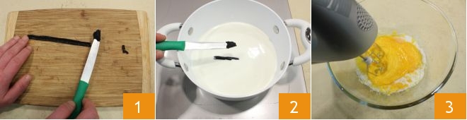 Para preparar las tartaletas rellenas de crema pastelera y guindas, comienza con la crema pastelera: toma la vaina de vainilla, córtala con un cuchillo y extrae las semillas raspándola 1. Añade las semillas y la vaina de vainilla a la leche y la nata vertidas en un cazo (puedes sustituir la nata por 50 g de leche) 2. Enciende el fuego a nivel bajo y cuando la mezcla haya rozado el hervor, apaga el fuego y deja la vainilla en infusión durante al menos 5 minutos. Mientras tanto, continúa la preparación separando las claras de las yemas; recoge estas últimas en un bol grande y añade el azúcar. Bate las yemas y el azúcar con una batidora eléctrica 3 o un batidor manual para obtener una crema homogénea.