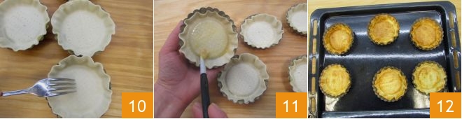 Adhiere bien el fondo y los bordes y pincha el fondo con los dientes de un tenedor 10; pinta los discos con la yema batida con la leche 11, luego hornéalos en horno estático precalentado a 200° durante 10 minutos (180° durante 5 minutos si es horno con ventilador; en este caso, puedes hornear uno para orientarte con los siguientes). Una vez horneados, sácalos del horno 12 y deja que se templen, luego desmóldalos y déjalos enfriar completamente sobre una rejilla.