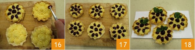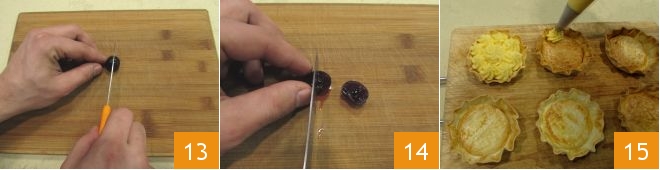 Mientras tanto, toma las guindas, escúrrelas del líquido de conservación y córtalas a la mitad 13, y saca dos cuartos de cada mitad 14. Toma la crema y viértela en una manga pastelera con boquilla de estrella para rellenar cada tartaleta 15