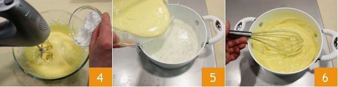 Cuando estén blancas y espumosas, añade la maicena tamizada 4 o de arroz y mézclala con el resto de la mezcla. Retira la vaina de vainilla de la leche y la nata calentadas y une la mezcla con los huevos 5. Enciende de nuevo el fuego a nivel bajo y mezcla continuamente con un batidor para espesar la mezcla 6.