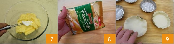 Una vez lista la crema, viértela en un bol 7 y cubre con papel film en contacto. Déjala enfriar primero a temperatura ambiente y luego guárdala en el frigorífico hasta el momento de usarla. Toma los discos de hojaldre 8, forra con cada disco 16 moldes estriados que midan 10 cm de diámetro en la parte superior y 8 cm en la parte inferior 9.