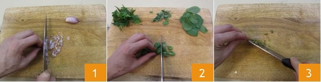 Pique finamente con un cuchillo la chalota 1 y pique las alcaparras bien lavadas 2. Pique ahora finamente también todas las hierbas, es decir, la mejorana, el perejil, la albahaca y la menta 3.