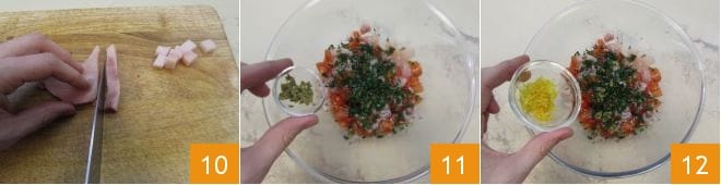 Proceda ahora a cortar en dados el filete de pez espada 10. Para un corte mejor, puede poner el filete media hora en el congelador, en rodajas de aproximadamente 1/2 cm de espesor, de las cuales obtendrá una brunoise muy fina. En un bol, mezcle los dados de pez espada con los tomatitos y las hierbas finamente picadas y añada las alcaparras 11, luego agregue a estos ingredientes la ralladura de limón 12.