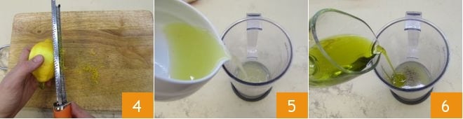 Luego prepare la emulsión. Obtenga la ralladura del limón con un rallador 4 y luego el jugo del mismo limón exprimiéndolo bien; vierta el jugo en un recipiente alto como una jarra 5 y luego, después de ajustar de sal y pimienta, añada el aceite 6.