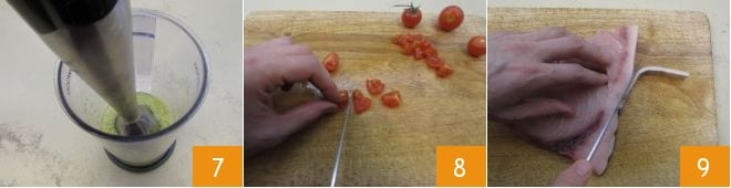 Emulsione con la ayuda de una batidora de mano hasta que la mezcla monte ligeramente 7. En este punto, pase a cortar los tomatitos en 4 y extraiga las semillas internas. Corte los tomatitos en una brunoise fina 8. Tome ahora el filete de pez espada. Se recomienda la compra de pescado congelado y congelar el pescado por 96 horas a -18 grados, para luego descongelarlo y emplearlo en la receta. Quite la piel externa de su filete de pez espada 9.