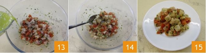 Condimente todo con la emulsión 13 obtenida justo antes de servir y mezcle bien los ingredientes 14. ¡Ahora solo le queda emplatar su tartar mediterránea de pez espada y disfrutar!