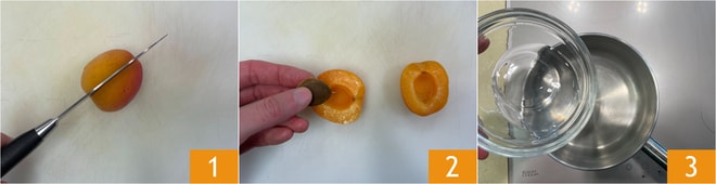 Para preparar la tarte tatin rápida de albaricoques, corten los albaricoques por la mitad 1 y quiten el hueso 2. Preparen el caramelo: pongan en un cazo el agua 3.