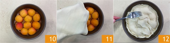 Deberían poder insertar aproximadamente 10 mitades por cada bandeja 10. Del hojaldre rectangular, corten dos discos de 16 cm. Coloquen una masa sobre los albaricoques 11 y encájenla bien en los bordes empujando con los dedos. Pinchen con un tenedor 12 y horneen a 180 grados durante unos 35 minutos.