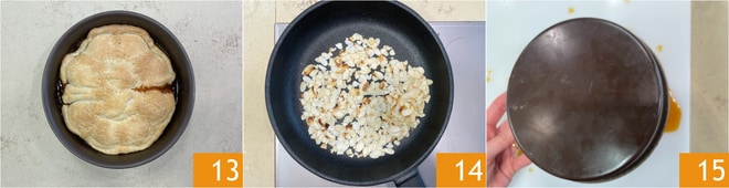 Una vez horneada, dejen enfriar a temperatura ambiente durante media hora para que el caramelo se solidifique un poco 13. Mientras tanto, tuesten las almendras en la sartén 14. Desmolden la tarte tatin ya tibia sobre una tabla de cortar 15.