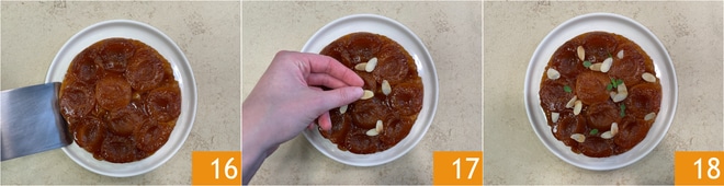 Emplátenla 16 y sírvanla con las láminas de almendra tostada 17 y hojas de mejorana. La tarte tatin rápida de albaricoques está lista para ser disfrutada 18.