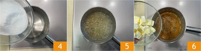Viertan el azúcar 4 y dejen que se forme el caramelo, calentando a fuego medio y constante 5, cuiden de que tome un bonito color oscuro (sin quemarlo). Cuando esté listo, apaguen el fuego y añadan la mantequilla en cubitos a temperatura ambiente 6.