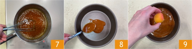 Mezclen bien con la batidora hasta que esté bien integrado 7. Vierten el caramelo a la mitad en las dos bandejas de 16 cm de diámetro 8 coloquen los albaricoques con la cara hacia abajo encajándolos bien en el caramelo 9.