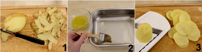 Para preparar la bandeja de patatas asadas, comienza pelando las patatas 1, luego lávalas bajo el agua corriente y sécalas bien. Mezcla en un cuenco el aceite con la mantequilla derretida y utiliza esta mezcla para engrasar una fuente para horno 2 (nosotros hemos utilizado una rectangular de 20x26 cm). En este punto, corta con un cuchillo afilado o con una mandolina las patatas en rodajas de aproximadamente 1,5 mm de grosor 3.