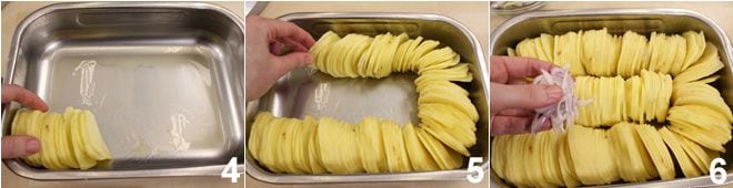 Coloca las rodajas verticalmente en fila en la fuente 4 (toma unas diez a la vez, al menos se mantendrán en pie), formando 3 filas de patatas dentro de ella 5. Corta las chalotas en rodajas y colócalas en los espacios vacíos entre las patatas 6,