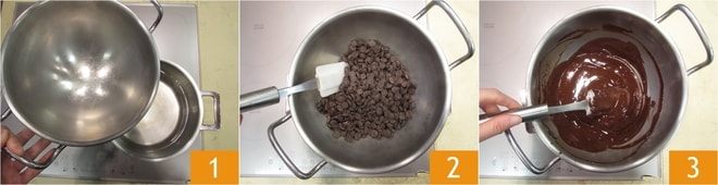 Para el templado del chocolate sobre mármol lo primero que debéis hacer es equiparos con un termómetro y fundir el chocolate. Podéis elegir si hacerlo en microondas o con el método del baño maría que os mostramos. Ponéd una olla con agua al fuego y colocad encima un bol 1. El agua no deberá hervir demasiado, de lo contrario, al evaporarse, podría caer en el chocolate. Verted entonces las pepitas de chocolate, o el chocolate troceado groseramente, dentro 2 y mezclad hasta que se haya derretido 3.