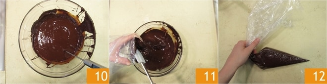Mezclad el chocolate y calentadlo nuevamente en microondas (pocos segundos, mezclad y medid nuevamente la temperatura) o a baño maría, hasta alcanzar la temperatura de 31°, ideal para ser trabajado. El chocolate está ahora templado, transferidlo a una manga pastelera 11 12 y usadlo inmediatamente para vuestras preparaciones, os mostramos algunos ejemplos.