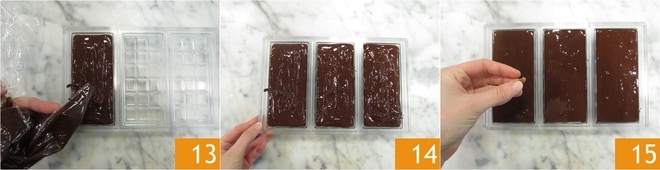 Después de haber templado el chocolate negro transferidlo a un molde para barras, hasta llegar al borde 13. Agitad el molde, golpeándolo suavemente para eliminar posibles burbujas de aire 14 y esperad unos segundos antes de añadir los frutos secos 15.