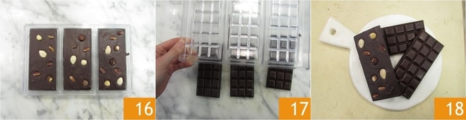 Colocadlo en la nevera durante 10 minutos, luego transferidlo a un lugar fresco y seco y dejadlo solidificar completamente 16. Notaréis que la parte superior del molde se volverá opaca, esto significa que el chocolate está bien cristalizado y solo tendréis que voltear el molde para extraer las barras 17. Las barras de chocolate caseras están listas 18.