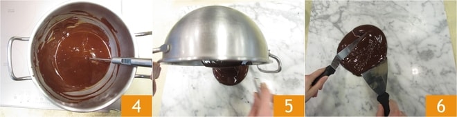 Usando un termómetro comprobad que haya alcanzado una temperatura de entre 50 y 55° 4. En este punto secad el fondo del bol con cuidado y transferid el chocolate al mármol limpio y perfectamente seco 5. Con la ayuda de dos espátulas empujad el chocolate en el mármol 6, esparciéndolo y recogiéndolo de nuevo hacia el centro para enfriar la manteca de cacao.