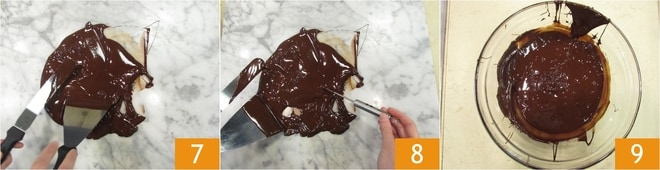 Notaréis que poco a poco el chocolate se volverá brillante y más denso 7. De vez en cuando medid la temperatura 8 y tan pronto como haya alcanzado los 29° transferidlo a un bol ayudándoos con las dos espátulas 9.