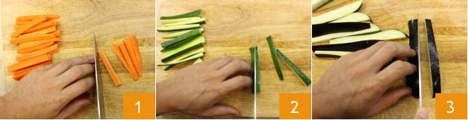 Para realizar la tempura de calamares y verduras, coloca el agua con gas en el congelador. Mientras tanto, lava y corta en tiras las zanahorias 1, los calabacines 2, las berenjenas 3,