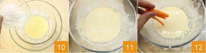 ) y la harina tamizada 10, mezcla rápidamente, no demasiado tiempo (no importa si se forman pequeños grumos de harina); la mezcla no debe quedar pegajosa. Pon a calentar un wok con abundante aceite de semillas 11 y cuando la temperatura del aceite alcance los 180°, podrás comenzar con la cocción (monitorea la temperatura con un termómetro para alimentos). Sumerge las verduras 12 en la masa para que estén completamente cubiertas,
