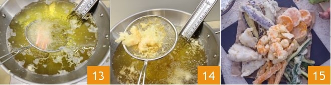 luego cocínalas en el aceite caliente 13 el tiempo necesario para dorar la masa (que no debe oscurecerse demasiado), luego escurre las verduras con una espumadera y déjalas secar sobre una bandeja forrada con papel absorbente. Continúa después con los calamares y langostinos 14. No frías demasiados ingredientes juntos, el aceite se enfriaría rápidamente. Sirve inmediatamente la tempura de calamares y verduras 15.