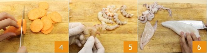 pela y corta en rodajas finas la batata 4. Limpia los langostinos: elimina la cabeza, el caparazón 5, extrae el intestino y resérvalos. Limpia los calamares: separa la cabeza, extrae las vísceras, elimina la piel y las aletas, y enjuágalos bajo agua corriente. Haz una incisión con un cuchillo en un lado de los calamares para abrirlos 6