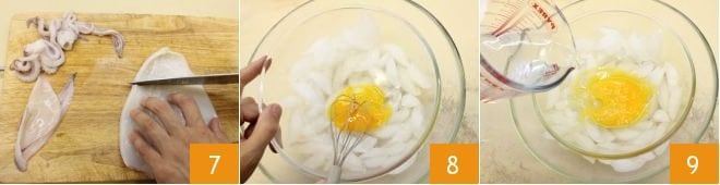 corta piezas de 3-4 cm de ancho 7 y resérvalos. Toma un bol y llénalo con hielo, coloca encima otro bol que lo pueda contener, bate la yema con un batidor 8, luego vierte el agua con gas helada 9