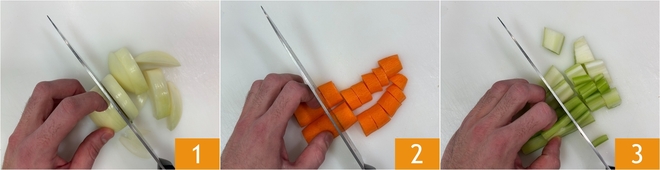 Para preparar el asado de ternera tierno con salsita, primero ata el rabillo de cadera siguiendo las indicaciones de nuestra ficha "Cómo atar el asado" e inserta la ramita de romero bajo el hilo (alternativamente, puedes pedírselo a tu carnicero de confianza). Ahora limpia la cebolla y córtala en trozos 1, luego haz lo mismo con las zanahorias 2 y el apio 3.