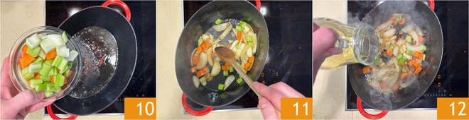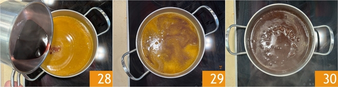 Agrega también la reducción de vino 28 y continúa la cocción a fuego lento durante 10-15 minutos 29, hasta obtener una consistencia fluida y cremosa 30.