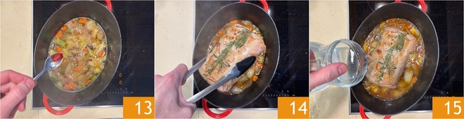 Agrega el concentrado de tomate 13, luego vuelve a colocar el asado en la cacerola 14 y cubre con agua 15.
