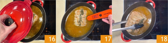 Cierra con una tapa 16 y cocina a fuego lento durante 3 horas, girando el asado cada hora. Puedes verificar la cocción con un termómetro: deberá alcanzar una temperatura de 85° en el centro 17. Transcurrido el tiempo de cocción, retira el asado de la cacerola 18 y mantenlo caliente.