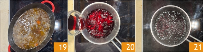 Sube el fuego y deja reducir el líquido a dos tercios; tomará unos 30 minutos 19. Mientras tanto, en un cazo vierte el vino tinto 20 y deja que también se reduzca a dos tercios manteniendo el fuego medio-alto; tomará unos 20 minutos 21.