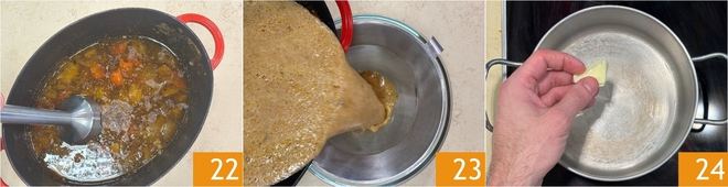Cuando la salsa se haya reducido, tritúrala con una batidora de mano 22 y pásala por un colador de malla fina 23. Mientras tanto, derrite la mantequilla en una cacerola aparte 24.