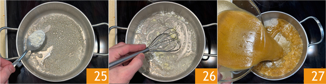 Añade el almidón de maíz a la mantequilla derretida 25 y mezcla rápidamente con una varilla 26, luego vierte la salsa colada 27.