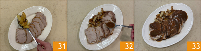 Estás listo para emplatar: corta el asado en lonchas y colócalas en un plato de servir, acompañándolas quizás con unas patatas al horno 31, luego baña generosamente con la salsa obtenida 32. ¡Tu asado de ternera tierno con salsita está listo para ser servido 33!