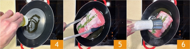 Calienta el aceite de oliva virgen extra en una cacerola de hierro fundido 4 y coloca dentro la pieza de carne 5, luego sala 6.