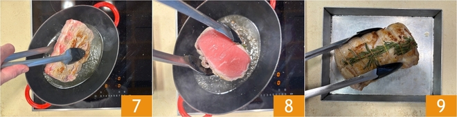 Mantén el fuego medio-alto y dora bien por todos los lados 7, para sellar la carne de manera uniforme 8. Una vez bien dorada, ponla aparte en una bandeja 9.