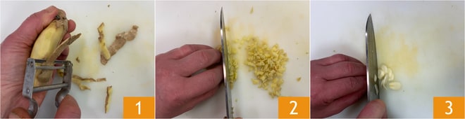 Para preparar la ternera con pimienta de Sichuan, lo primero que debes hacer es pelar el jengibre 1 y picarlo finamente con un cuchillo 2. Pela y corta el ajo en rodajas 3.