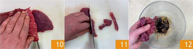 Corta el filete de ternera primero en medallones finos 10, luego en tiras 11, y después transfiere la carne al bol 12.