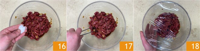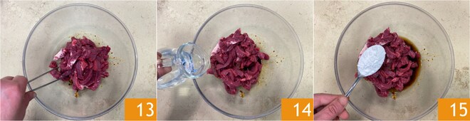 Mezcla bien 13 para que la carne quede uniformemente cubierta por la marinada. Finalmente, vierte el agua 14, la fécula de patata 15 y vuelve a mezclar.