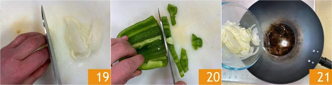 Mientras tanto, limpia y corta la cebolla en rodajas 19 y el pimiento en tiras 20. En el wok, vierte el aceite de cacahuete y caliéntalo bien. Luego agrega la cebolla 21 y sofríe durante 3-4 minutos a fuego alto.