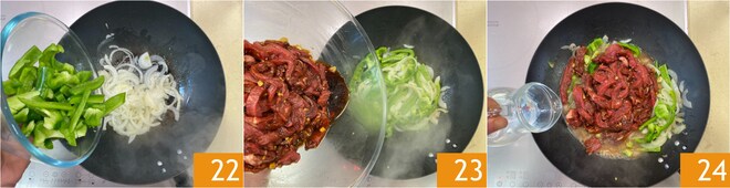 Agrega los pimientos 22 y cocina por otros 3-4 minutos, luego añade las tiras de carne con su marinada 23 y el agua 24.