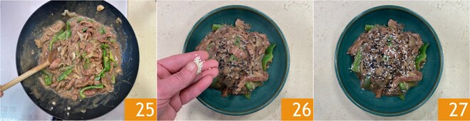 Cocina todo durante 3-4 minutos, siempre a fuego alto y removiendo con frecuencia 25. Emplata y completa con semillas de sésamo blancas y negras 26. ¡Tu ternera con pimienta de Sichuan está lista para ser servida 27!