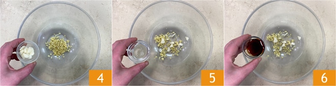 En un bol, coloca el jengibre y el ajo 4, luego añade el vino de arroz 5 y la salsa de soja 6.